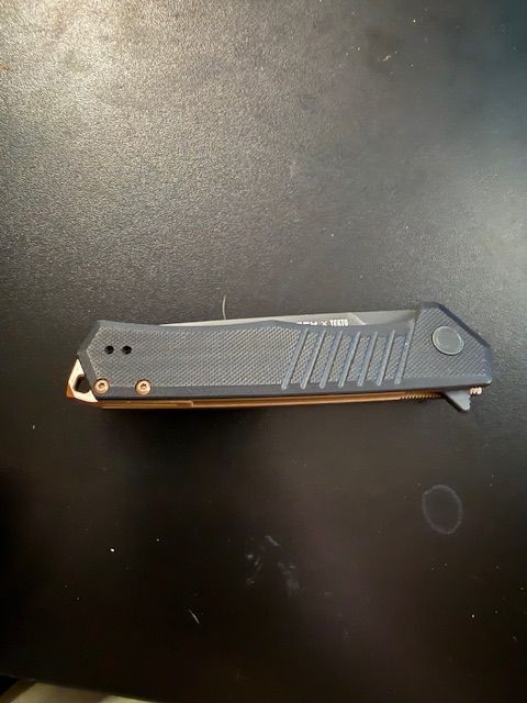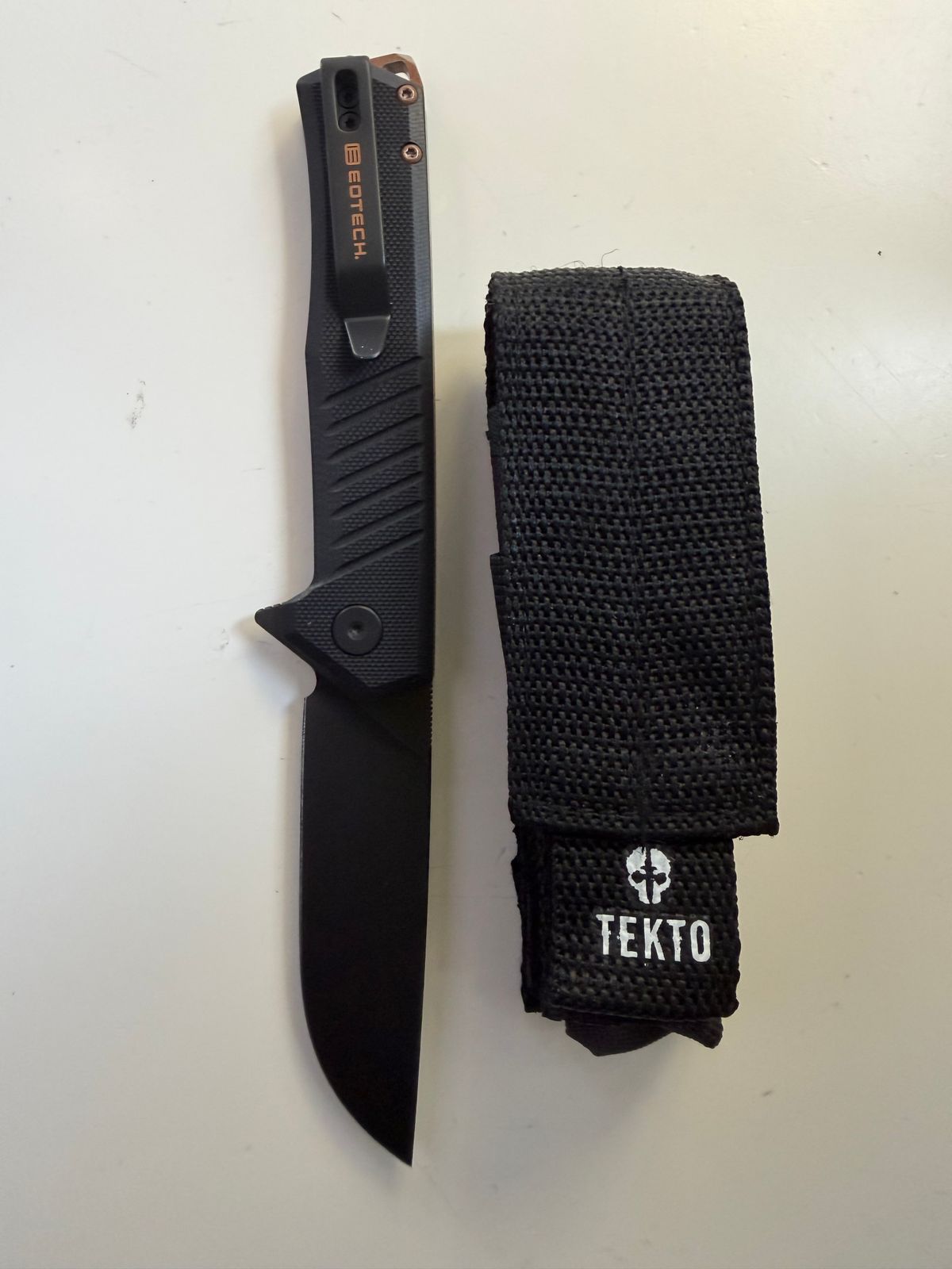 Tekto asked me to review the F1 Alpha and EOTECH knife a few weeks ago. I already own Tekto's F1 Alpha (green scales). I received the knife in a brown-ish box, similar to some of the EOTECH sights I have bought before. The knife is very similar to the original F1 Alpha but it features the EOTECH logo, color, and branding. I haven't had the knife for long but the original F1 Alpha has been exceptional and I have no reason to think this one will be any different. Only change Id recommend is to include a few more EOTECH elements so its a different knife than the F1 Alpha. Overall this is an amazing knife, thanks guys!