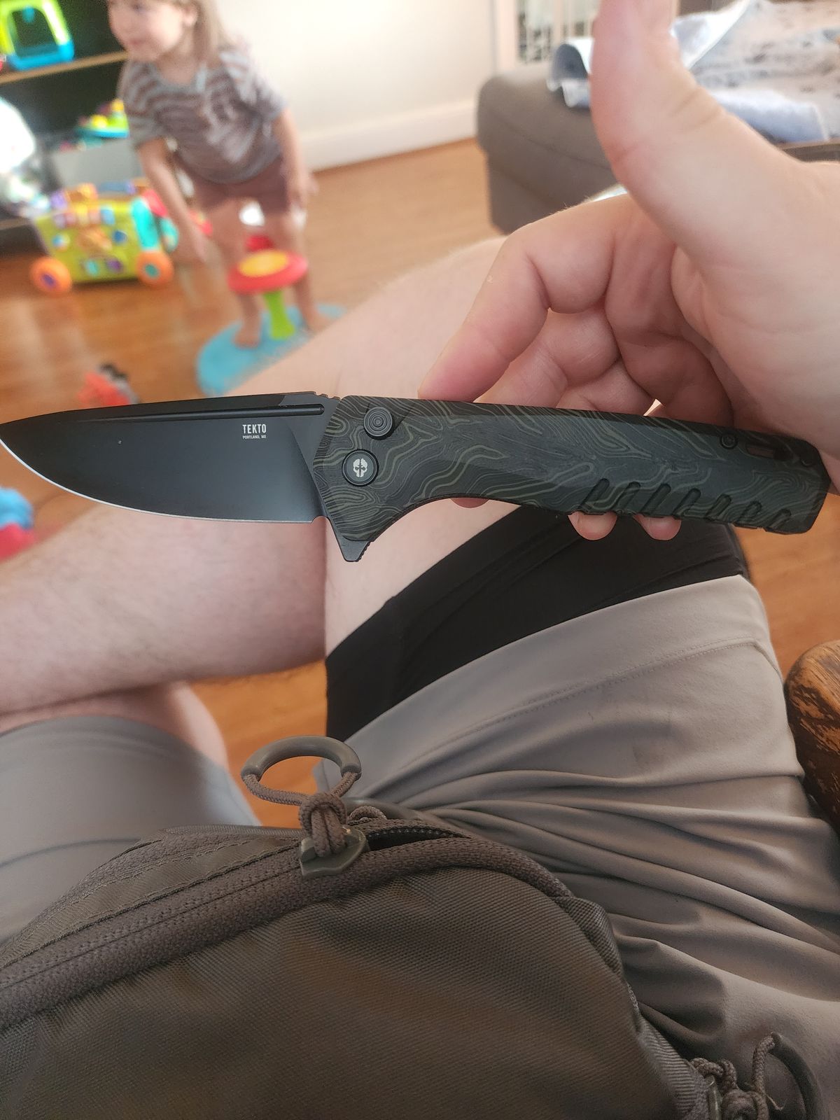 This is a second knife I got from Tekto. I bought the first one, this one I received as a gift. The F3 is a much larger knife than the other folders put out by Tekto. The blade is much bigger and you feel like it can take a punishing. The scales are G10 and are pretty comfortable, they fit well into my hand. I have no use the lanyard hole, thats not for me. The coolest thing about the F3 is the button lock, its addicting. Very smooth opening and closing, probably due to the ceramic ball bearings. I have not used the flipper much as I use the button lock, but they both work. Great knife, I recommend it.