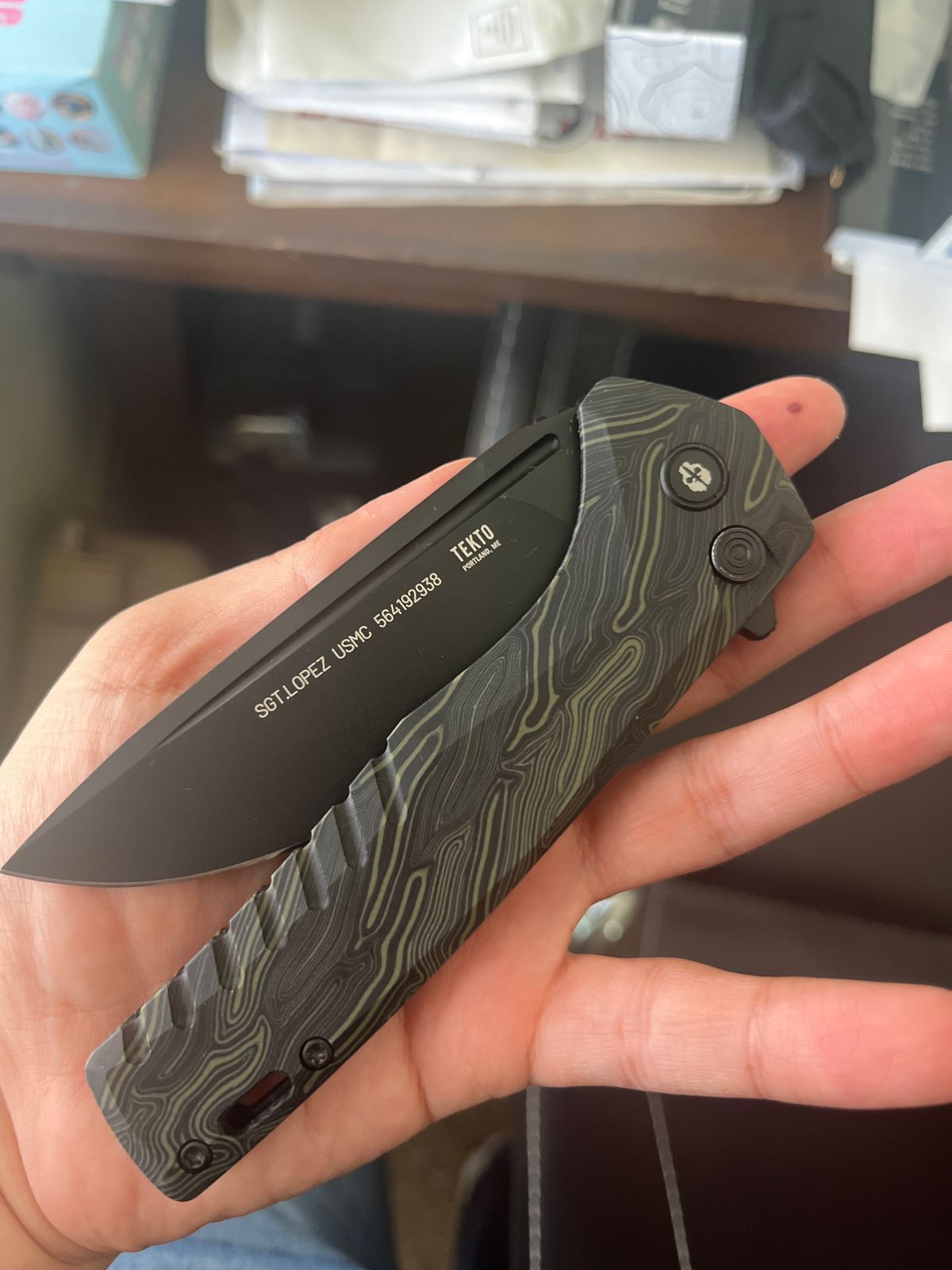 This is a second knife I got from Tekto. I bought the first one, this one I received as a gift. The F3 is a much larger knife than the other folders put out by Tekto. The blade is much bigger and you feel like it can take a punishing. The scales are G10 and are pretty comfortable, they fit well into my hand. I have no use the lanyard hole, thats not for me. The coolest thing about the F3 is the button lock, its addicting. Very smooth opening and closing, probably due to the ceramic ball bearings. I have not used the flipper much as I use the button lock, but they both work. Great knife, I recommend it.